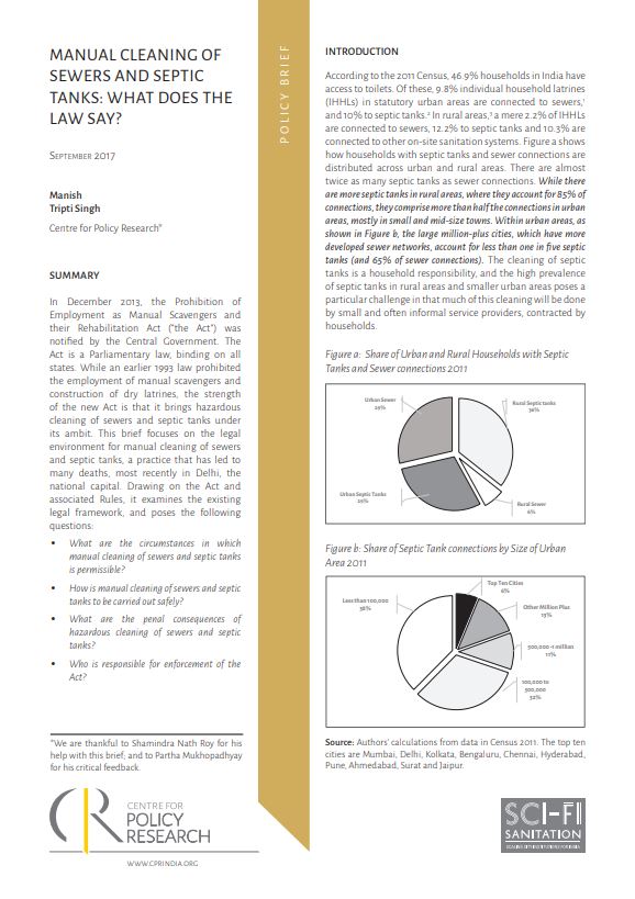 In December 2013, the Prohibition of Employment as Manual Scavengers and their Rehabilitation Act (“the Act”) was notified by the Central Government. The Act is a Parliamentary law, binding on all states. While an earlier 1993 law prohibited the employment of manual scavengers and construction of dry latrines, the strength of the new Act is that it brings hazardous cleaning of sewers and septic tanks under its ambit. This brief focuses on the legal environment for manual cleaning of sewers and septic tanks, a practice that has led to many deaths, most recently in Delhi, the national capital. Drawing on the Act and associated Rules, it examines the existing legal framework, and poses the following questions:
