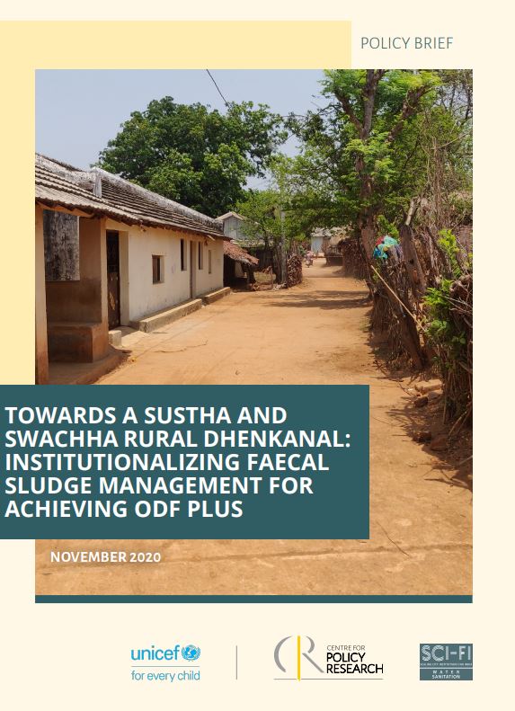 Following significant national gains in access to a toilet facility under the Swachh Bharat Mission – Gramin (SBM-G), the Ministry of Jal Shakti launched the programme’s second phase in 2020. SBM-G Phase II places an emphasis on and funds interventions in sanitation beyond the toilet including Faecal Sludge Management (FSM). Nonetheless, FSM – a novelty among rural administrations – is yet to gain traction as a prerequisite to Safely Managed Sanitation in specific socio-spatial contexts. The present Policy Brief employs insights from a novel district-level sanitation survey in Dhenkanal, Odisha, and secondary data to support the District Administration, Dhenkanal, and the Panchayati Raj and Drinking Water Department, Government of Odisha in evaluating the need for FSM in the district in relation to the recommended alternative strategies. The Policy Brief argues that neither retrofitting single pits to twin pits nor FSM is an exclusively optimal solution in the district owing to its local specificities. It concludes with a roadmap for the Dhenkanal District Administration towards achieving district-wide Safely Managed Sanitation.
