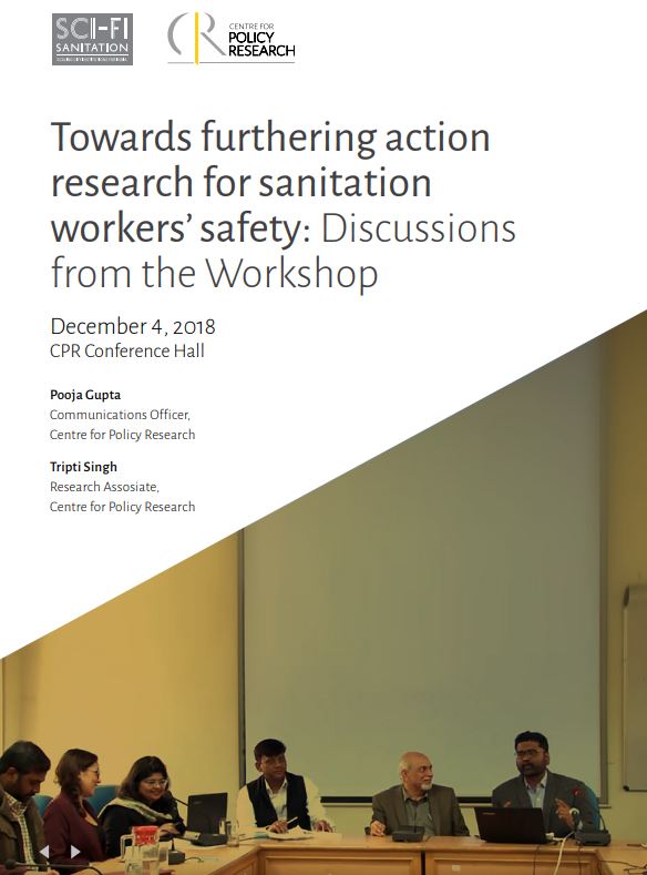 The Centre for Policy Research organized a workshop titled “Towards Furthering Action Research for Sanitation Workers’ Safety” on December 4, 2018. The objective of the workshop was to build knowledge-sharing networks, learn from experiences of various states and initiate a broader discussion on alternative livelihood option available to sanitation workers. The workshop deliberated broadly on two themes. Firstly, it discussed insights from the field to build an understanding of social, legal, technical and financial issues and challenges sanitation workers face. Secondly, it deliberated on the challenges of bringing sanitary workers into alternative livelihood options. This was followed by a discussion on developing an action research agenda for future in the Indian context and exploring possible solutions to improve sanitation workers’ safety.